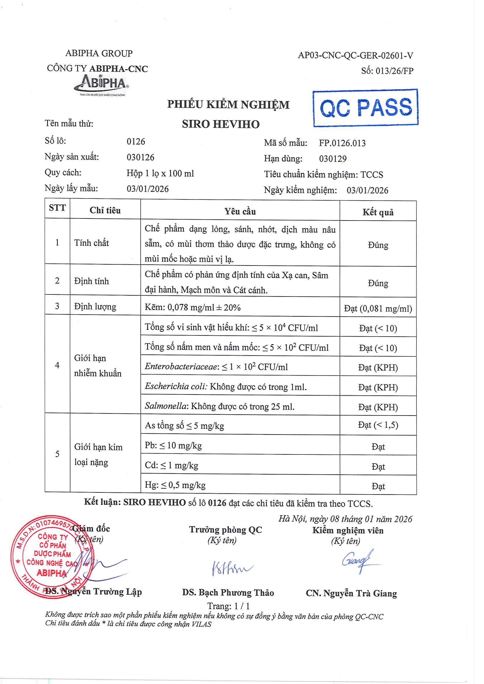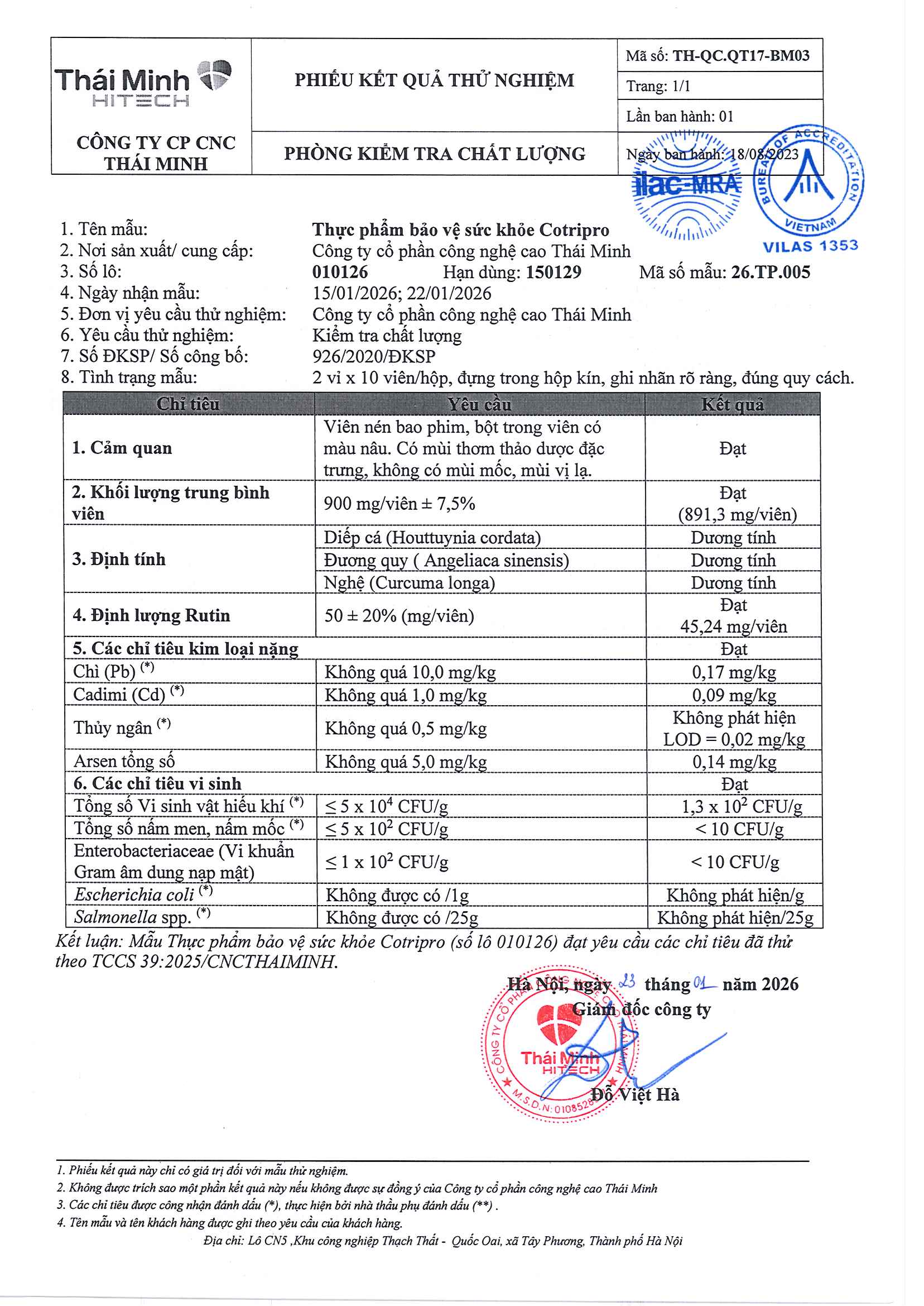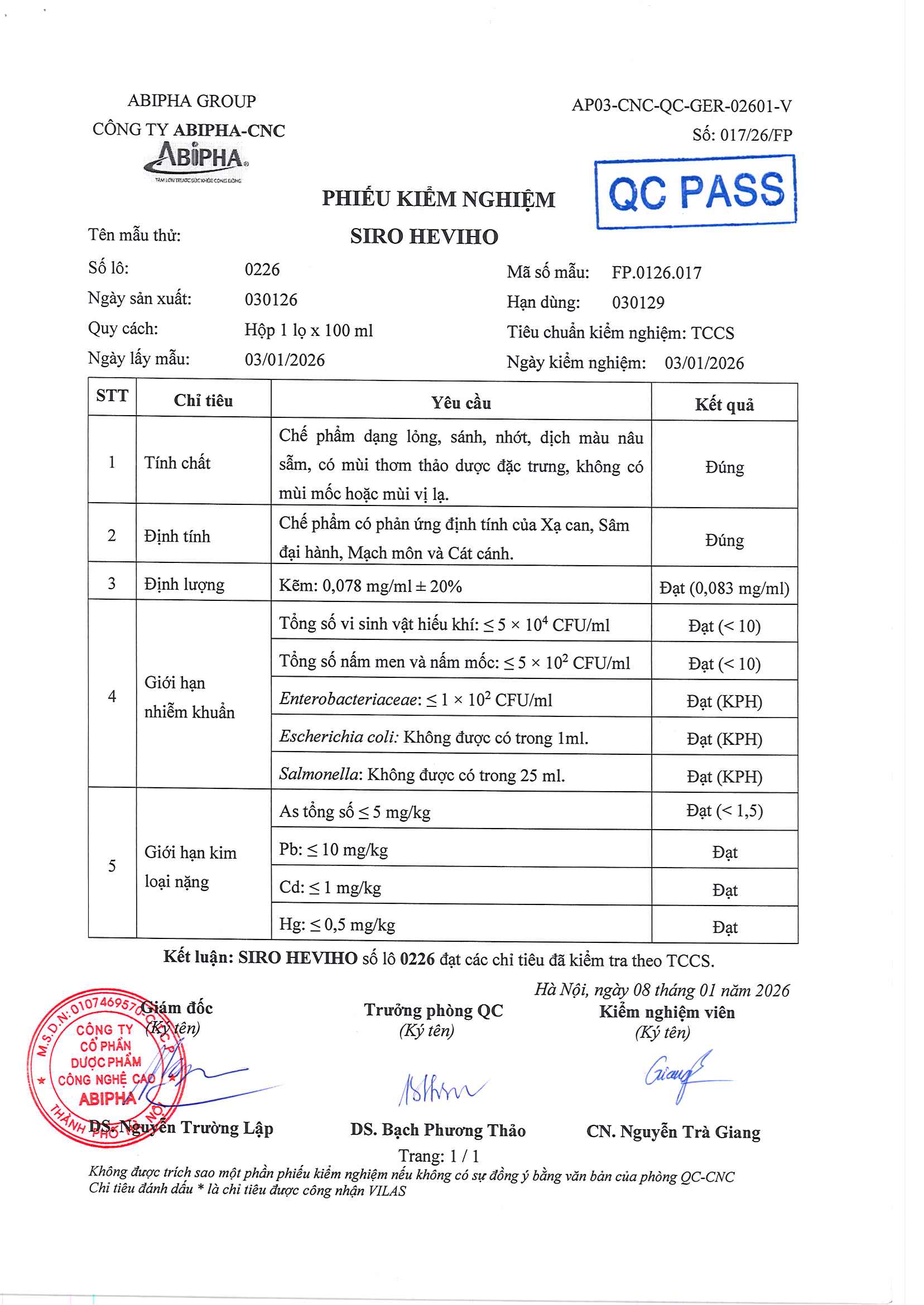• Kết quả "Đạt" hoặc "Không phát hiện" là tốt, cho thấy sản phẩm an toàn, không nhiễm khuẩn hay kim loại nặng.