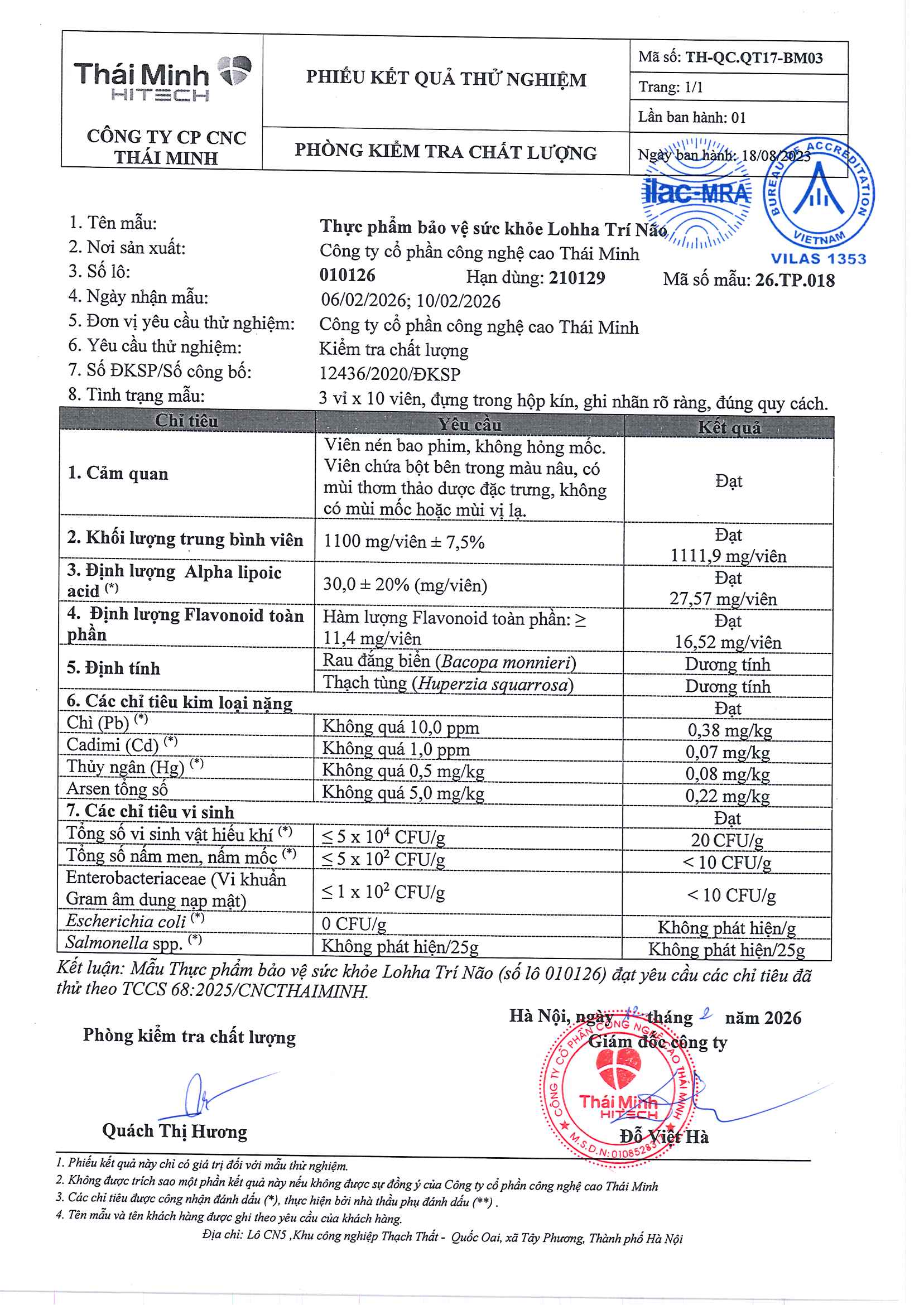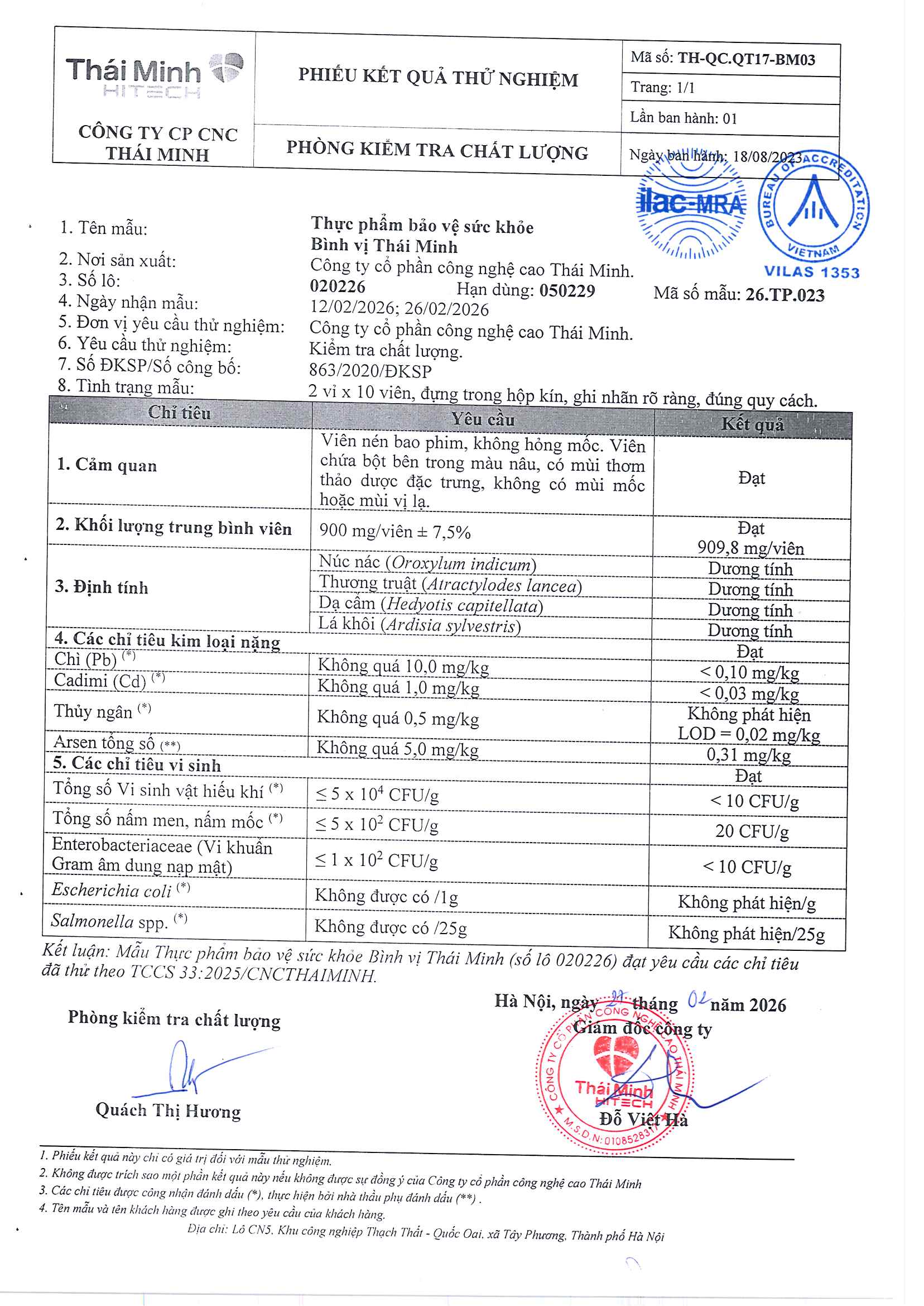 • Kết quả "Đạt" hoặc "Không phát hiện" là tốt, cho thấy sản phẩm an toàn, không nhiễm khuẩn hay kim loại nặng.