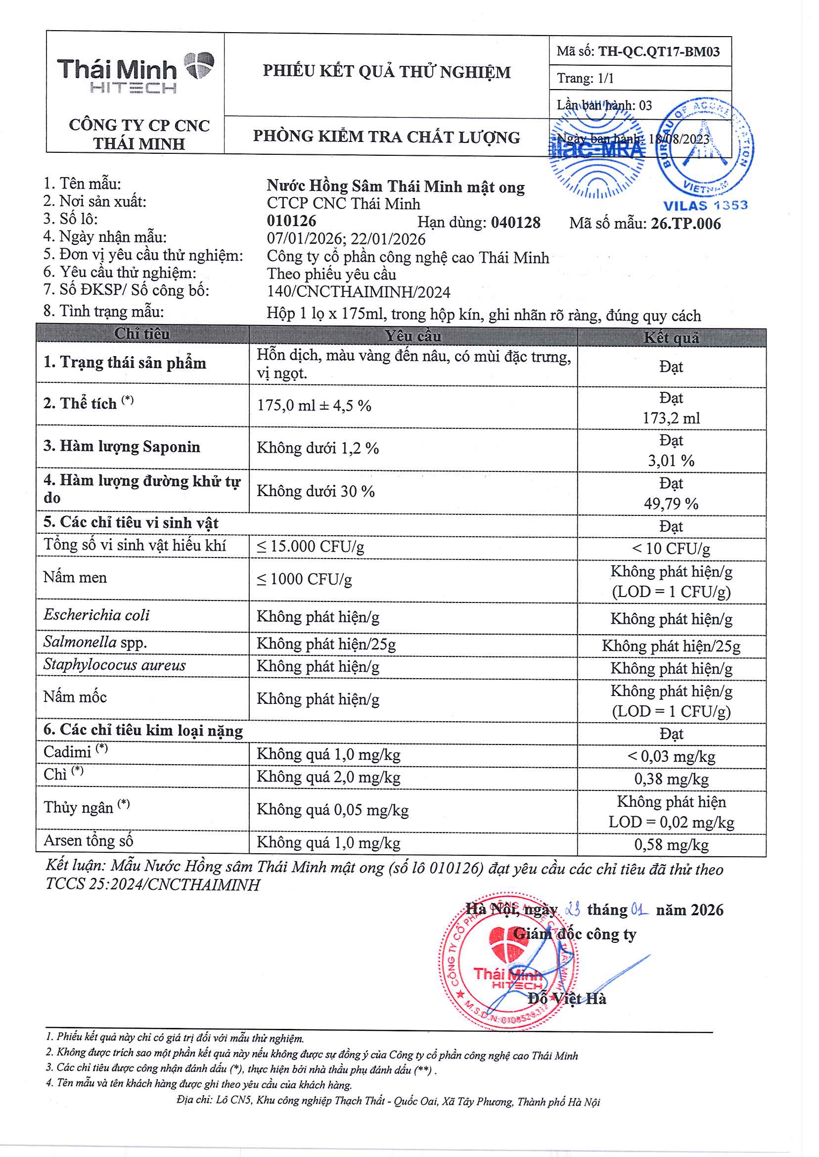 • Kết quả "Đạt" hoặc "Không phát hiện" là tốt, cho thấy sản phẩm an toàn, không nhiễm khuẩn hay kim loại nặng.