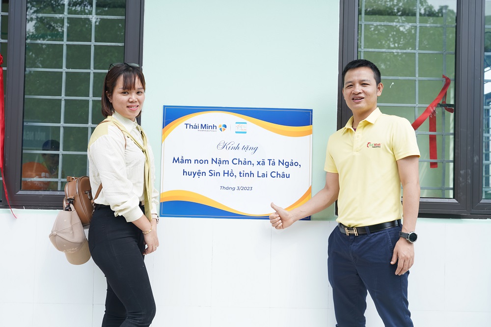 Chị Nguyễn Thị Thu Dung - chủ nhà thuốc tại Phú Thọ chụp ảnh cùng anh Phạm Hữu Khánh - TGĐ Dược phẩm Thái Minh trong chuyến đi khánh thành Ngôi trường ước mơ