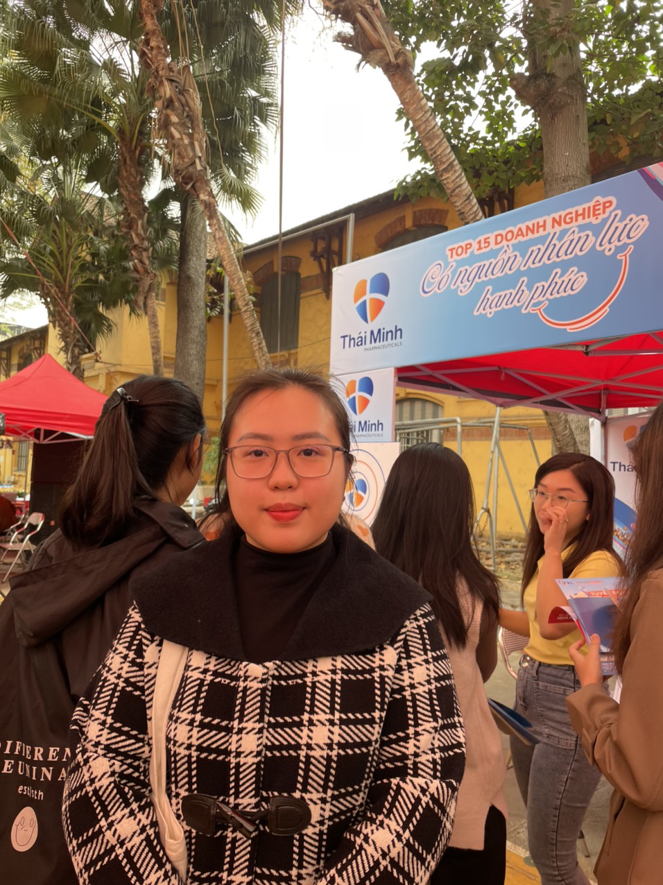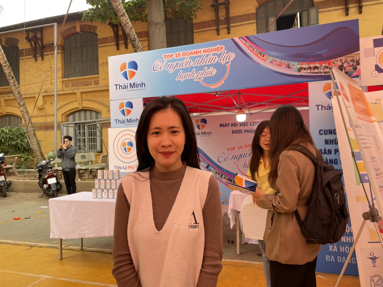 Bạn Trịnh Bích Ngà – sinh viên K73, khoa dược học, biết đến dược phẩm Thái Minh qua sản phẩm Maxxhair sau khi xem quảng cáo và dùng sản phẩm hiệu quả. Đến tham quan gian hàng của Thái Minh, Ngà chia sẻ mong muốn tìm hiểu yêu cầu khi tuyển dụng vào vị trí Marketing để có thể trang bị cho mình hành trang trước khi ra trường.